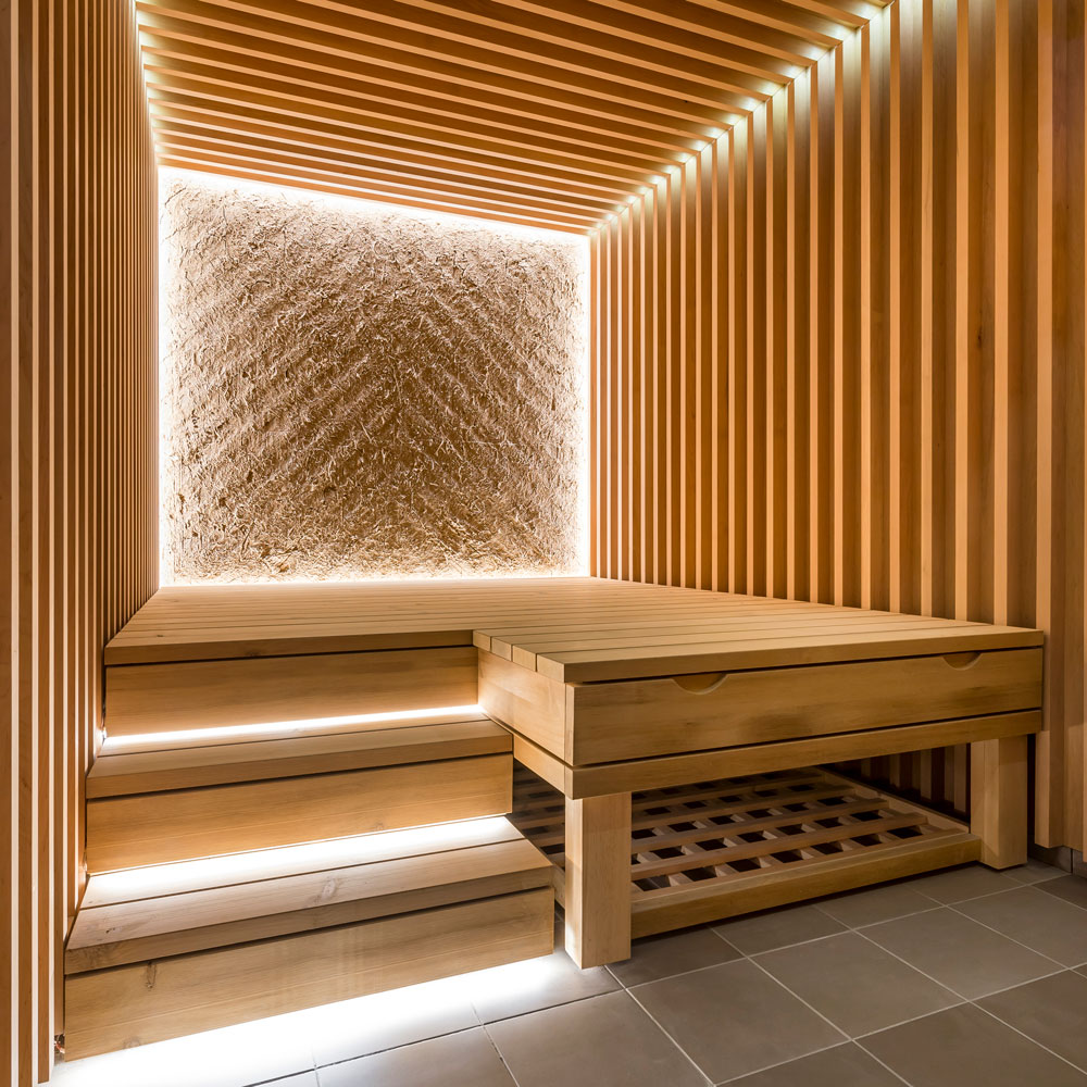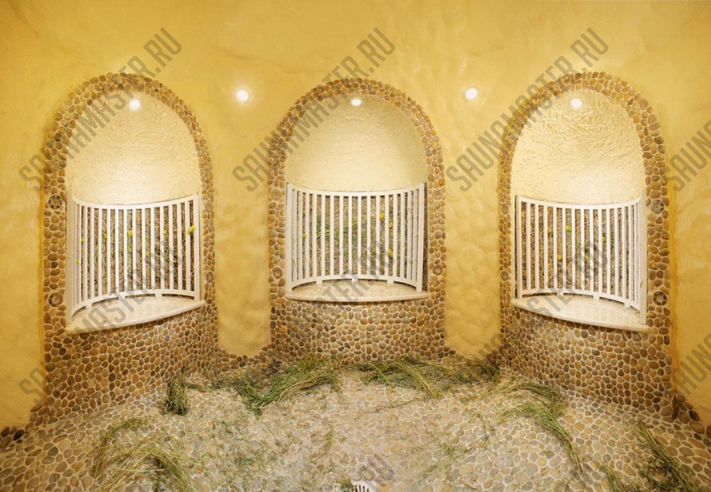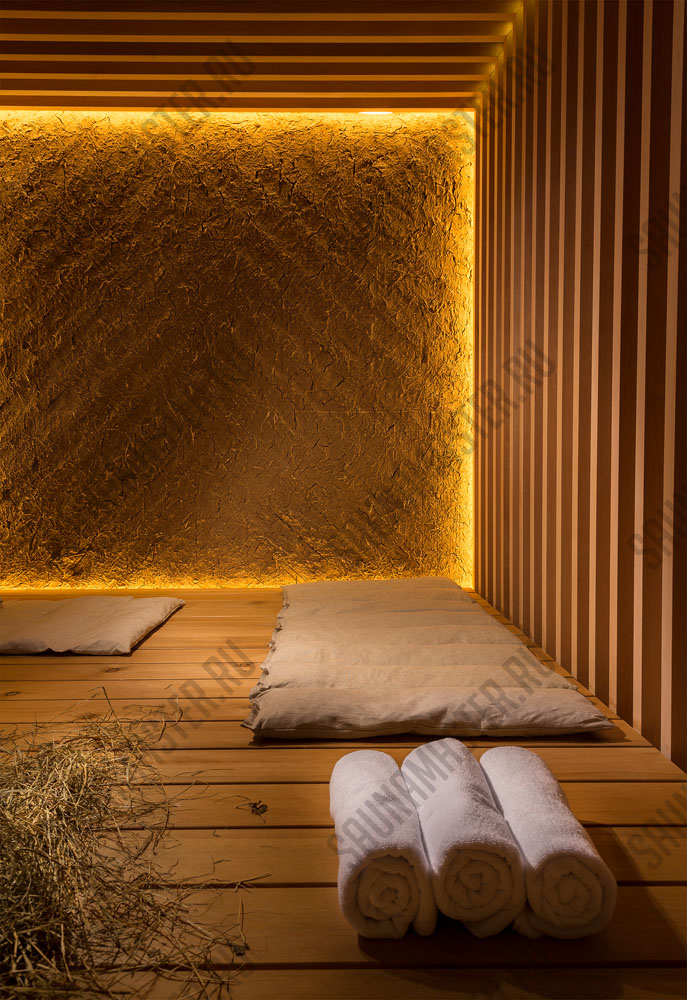 Сенная сауна – теплое помещение для отдыха и расслабления. Здесь для декора внутреннего пространства использованы брикеты из настоящего сена. При невысокой температуре человек может находиться в парной достаточно долго, вдыхая пары разнотравья. Такая баня отлично подойдет для того, чтобы расслабиться перед СПА процедурой, или отдохнуть после тяжелого рабочего дня. А низкий температурный режим делает ее доступной как для маленьких детей, так и для взрослых, которым не показаны высокие температурные нагрузки.