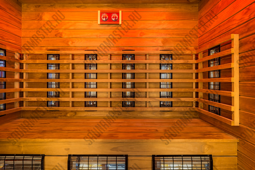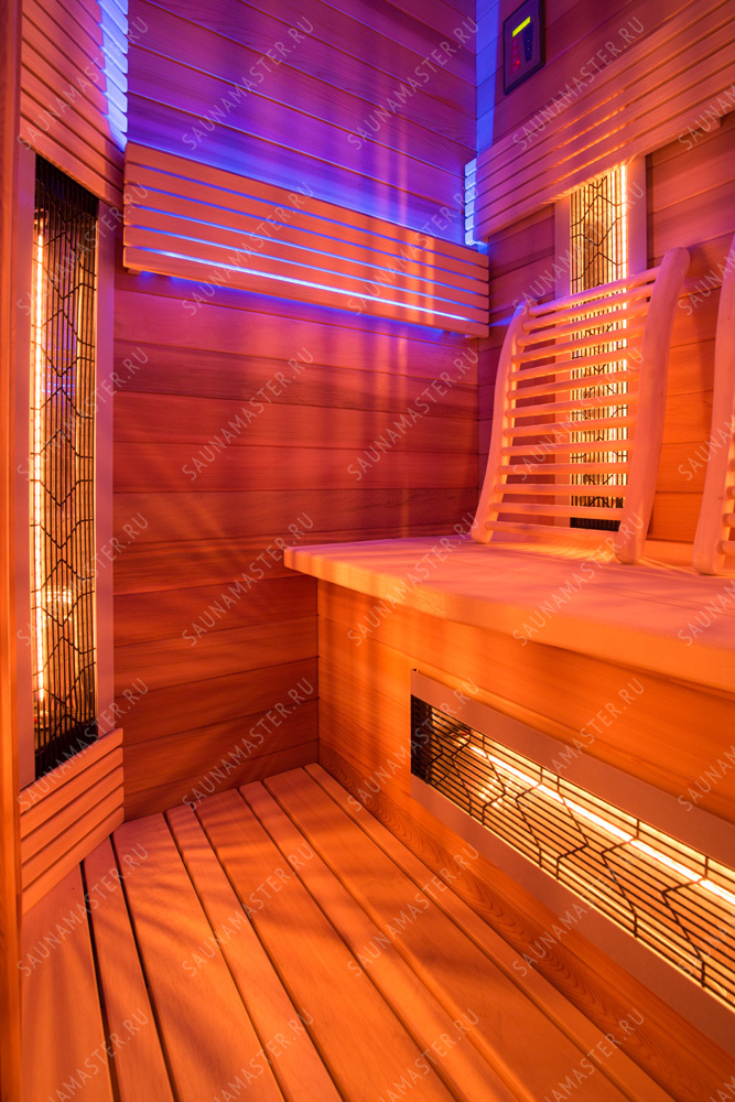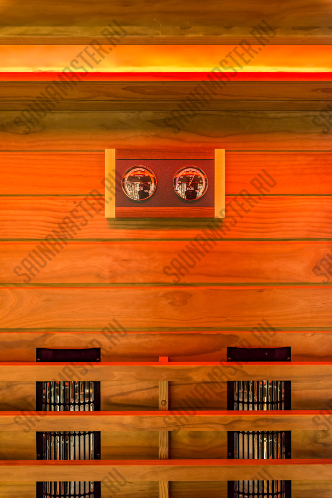 Оборудование (пример): ИК-излучатели EOS, комплект освещения для сауны WDT, комплект светодиодных линеек RGB для подсветки полка, пульт управления