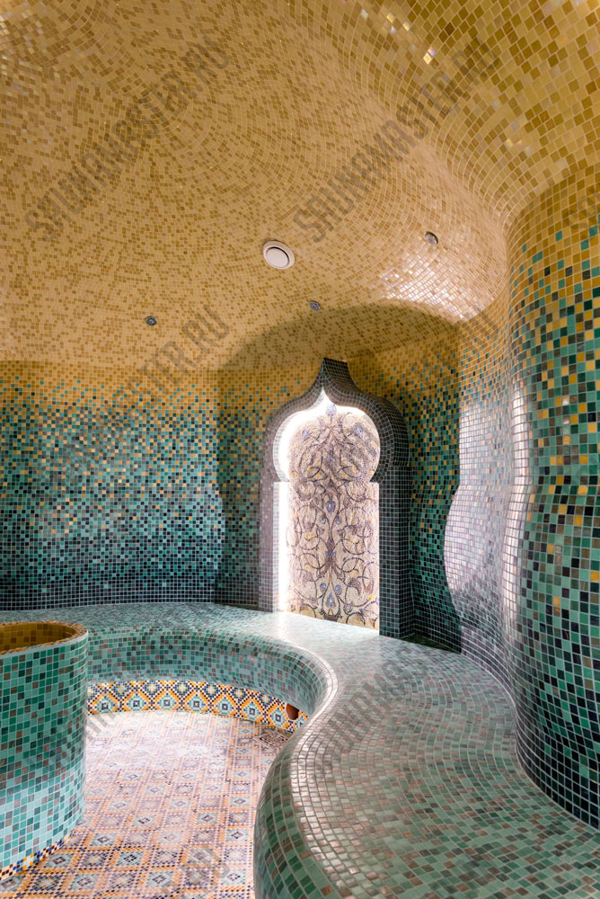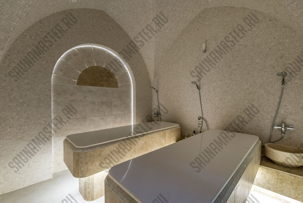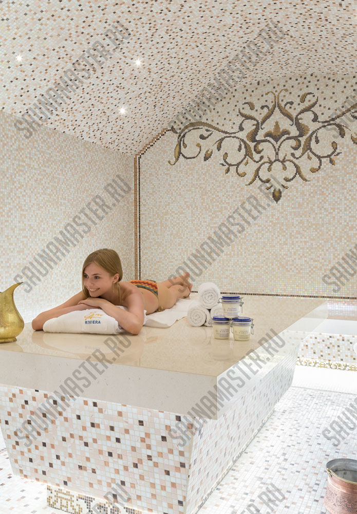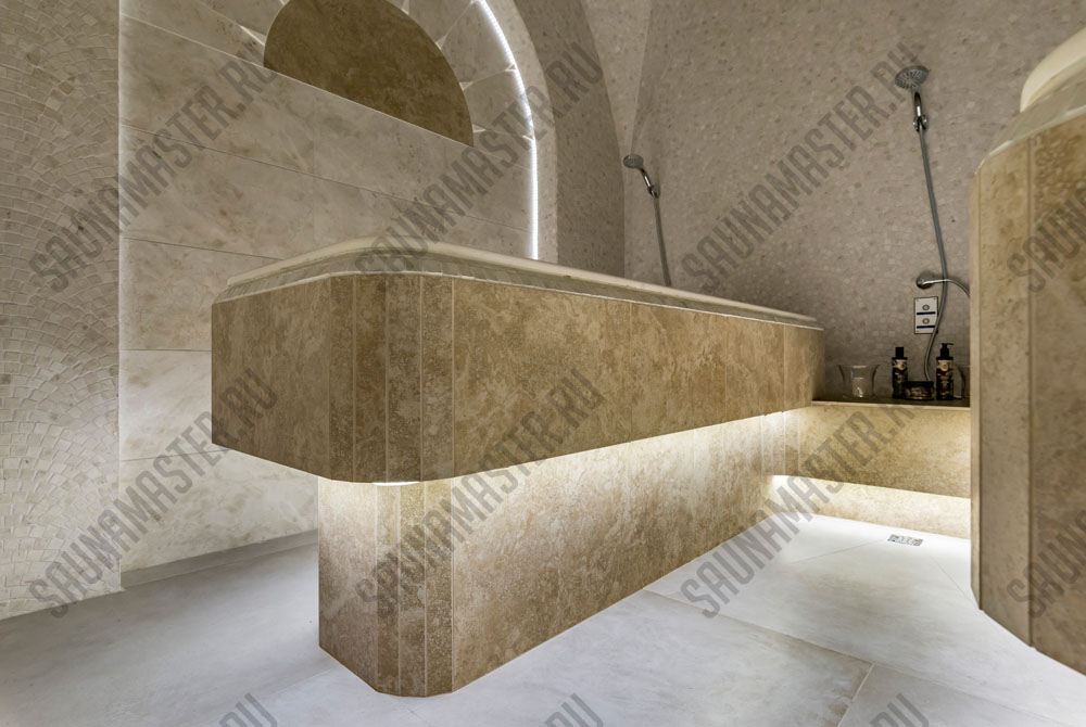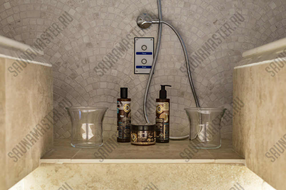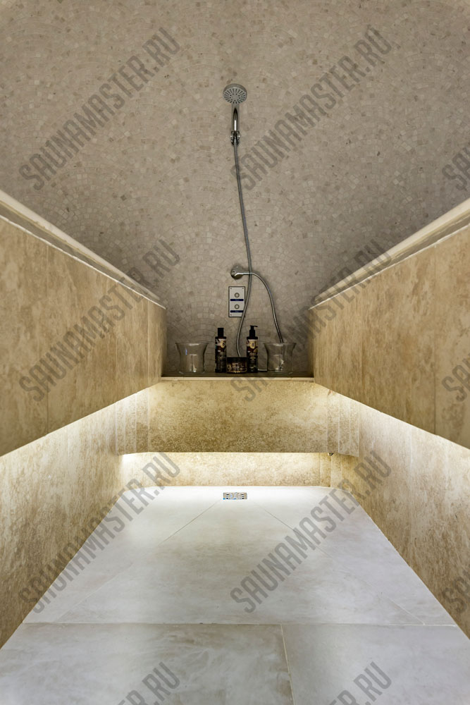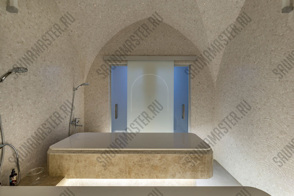 Материалы: готовый комплект конструктива для римской бани из пенополистирола Lux Elements, отделка мозаика, мрамор либо керамика Sommerhuber, стеклянная дверь EOS.