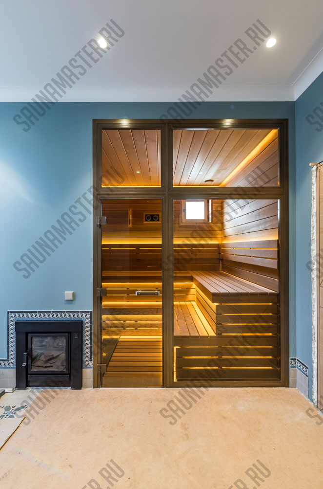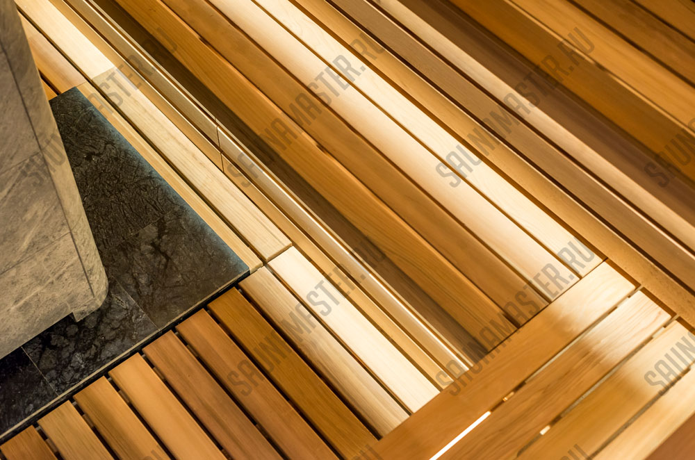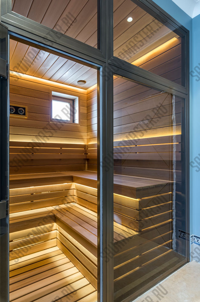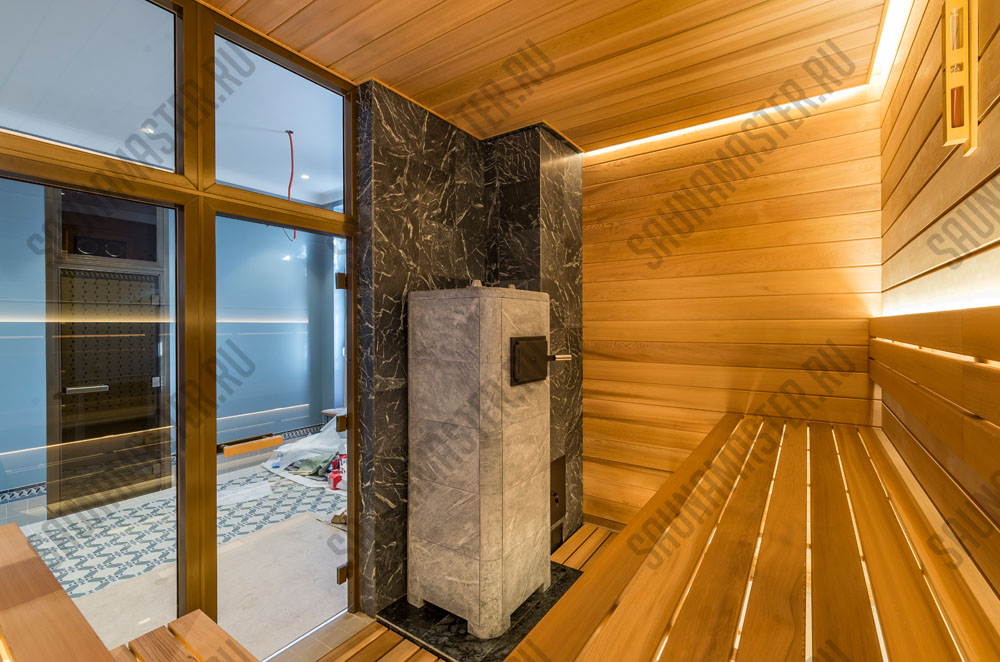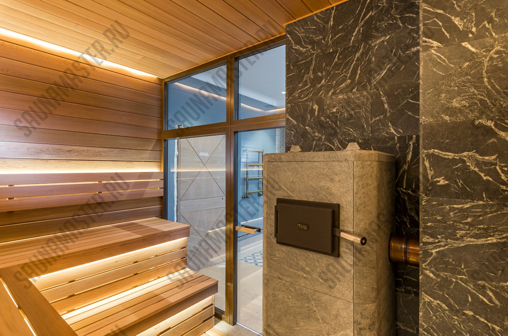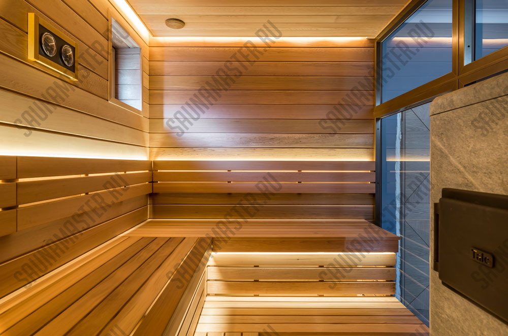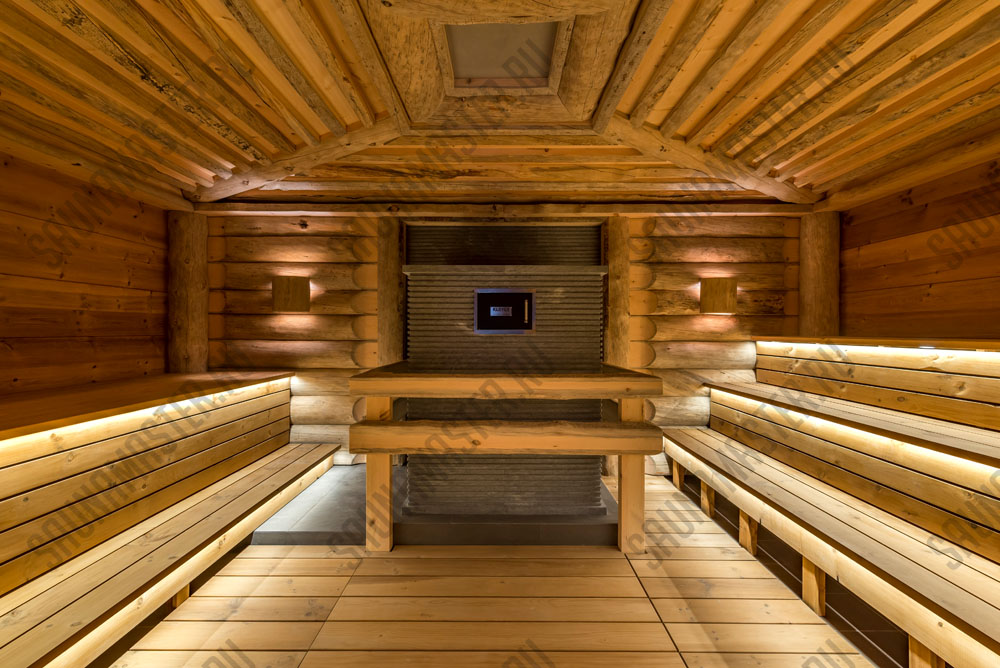 Оборудование (пример): электрическая печь EOS Мельница, газовая печь Helios или дровяная Klover, комплект освещения для сауны WDT, комплект светодиодных линеек RGB EOS для подсветки полка, пульт управления, парогенератор EOS Steamrock II R.